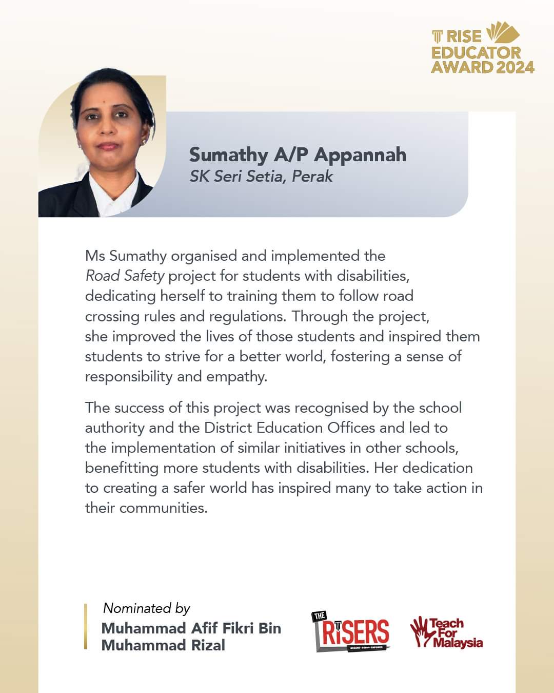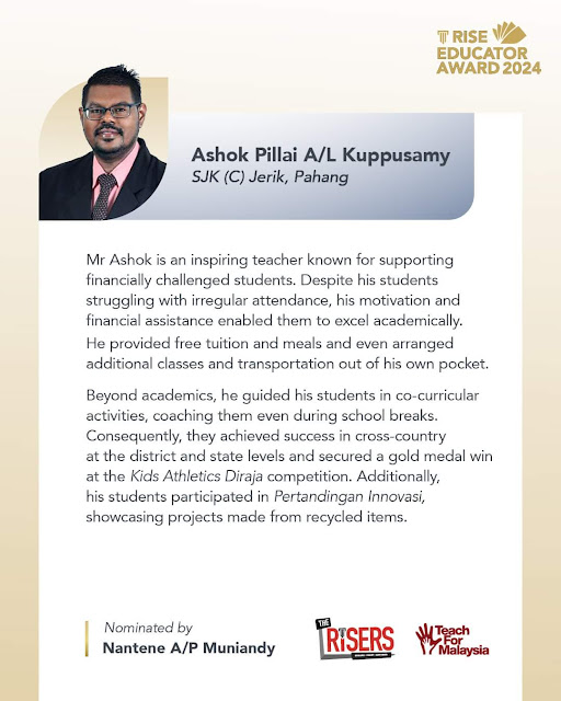 Alhamdulillah. Tak pernah sangka akan tercalon dan disenarai pendekkan sebagai Top 10 Rise Educator Award ni. Tiba-tiba je dapat tagging notifications dari rakan-rakan Facebook. Rupa-rupanya, murid saya Kaviraj telah menghantar pencalonan saya untuk anugerah ini. Dia gunakan penulisan yang sama semasa dia menghantar pencalonan saya untuk Anugerah McDonald's pada Tahun 2022. Rasa terharu sangat.